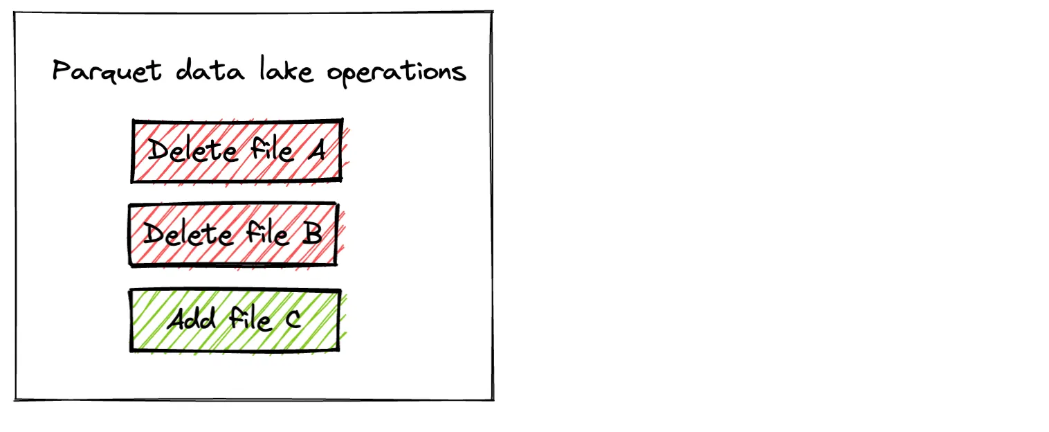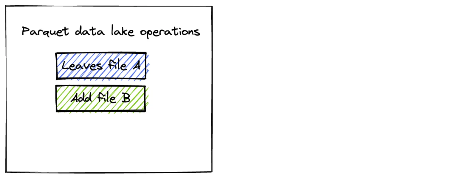 • The Parquet table is in an unusable state for readers while the overwrite operation is being performed. For example, a concurrent reader may see a “mid-computation state”: file A gets deleted but file B still exists, which is not a valid table state.