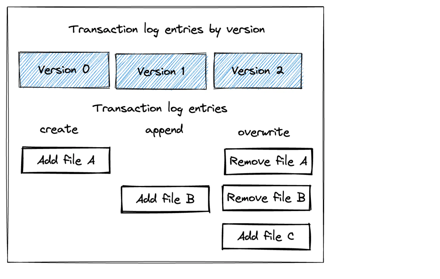 Important: Note that a Delta Lake overwrite operation does not delete any of the underlying Parquet files. It simply makes an entry in the transaction log to ignore the existing files (a logical delete). It doesn’t actually remove the files (a physical delete). Take a look at the following diagram to get some intuition about the three transaction log entries corresponding to the actions taken on this Delta Lake.