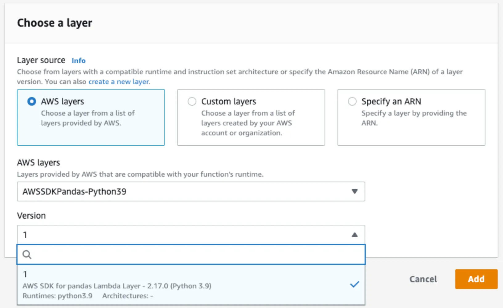 First, add the AWS SDK for pandas layer. As the screenshot below shows, the layer is fully managed, and available directly in the AWS console, so we don’t need to package anything like we did the deltalake layer. You can read more about this in the official documentation.
